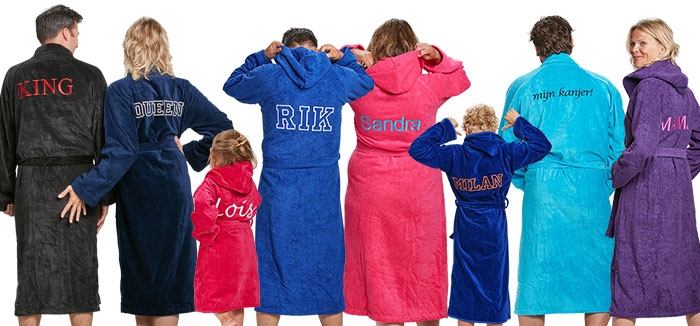 Een badjas met naam is verkrijgbaar in diverse maten en kleuren. Of je nu een badjas met capuchon zoekt of liever een badjas met sjaalkraag voorziet van een borduring: alles is mogelijk. Wij personaliseren een babybadjas, kinderbadjassen, sauna badjas, badjassen voor heren en badjassen voor dames. Gepersonaliseerde badjassen mogen niet geruild worden.