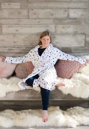 .Deze fleece badjas is voorzien van geborduurde sterren in verschillende kleuren.