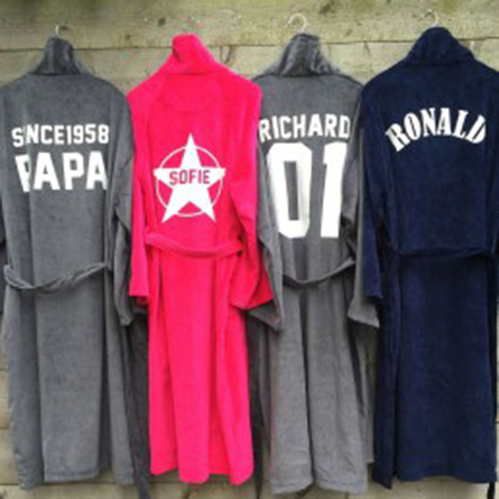 Een badjas personaliseer je binnen een handomdraai in onze webshop. Je hebt de keuze uit badjassen met en zonder capuchon. Ook qua materiaal kun je kiezen uit verlours of terry. Wij hebben badjassen met naam voor dames, heren en kinderen.