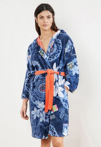 Deze katoenen velours badjas met bloemmotief in blauwtinten. De badjas heeft een oranje binnenkant en ceintuur en is voorzien van een capuchon.