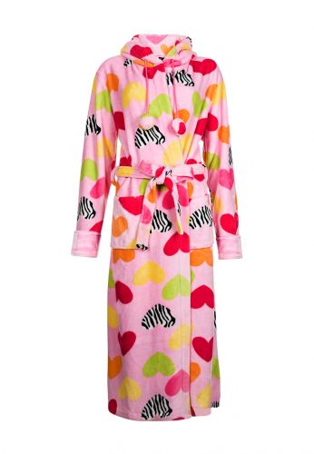 .Badjas uit de nieuwe badjassen collectie van badjasparadijs.nl. Een mooie roze badjas met verschillende kleuren hartjes. Het perfect cadeau voor je vriendin of vrouw. Elke ochtend en avond zal ze aan je denken zodra ze de badjas aantrekt. Deze badjas voorzien van een capuchon.