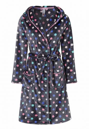 Deze fleece badjas met capuchon is voorzien van een kleurrijk polka dots motief. Leuk? Wij vinden van wel.
