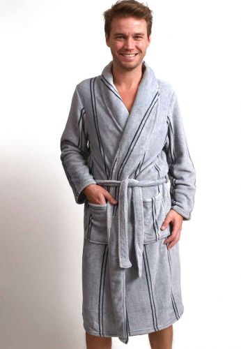 Voor mannen met stijl! Deze licht grijze herenbadjas met blauw streepmotief is gemaakt van 250 grams fleece. Relaxen maar!