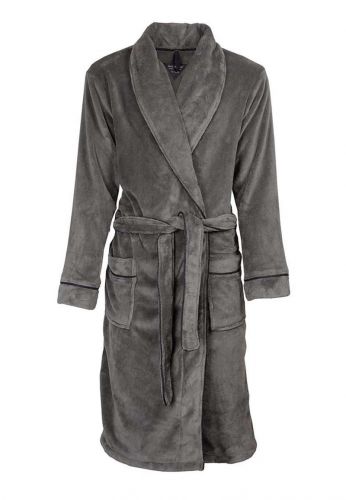 Deze fleece badjas voor heren is leverbaar als grijze badjas & is afgezet bij de mouwen, zakken, kraag en ceintuur in de contrast kleur blauw.