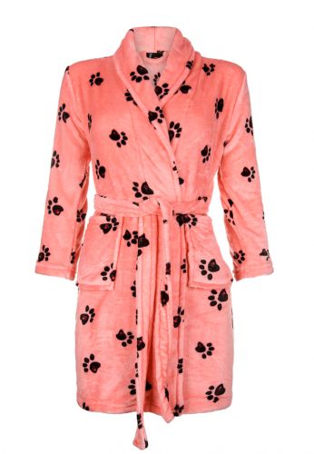 Toch leuk? deze roze badjas voorzien van zwarte hondenpootjes. En nog leuker. Te bestellen voor de kids en in volwassen maten. Samen genieten in dezelfde badjas!