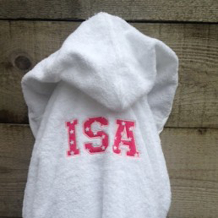 Om je badjas helemaal persoonlijk te maken, kun je ook kiezen voor een badjas met naam. Voor kinderbadjassen hebben wij een hele leuke optie. Naast gewoon borduren in allerlei kleuren en lettertypes, kunnen we naam ook als patches van gekleurde stof op de badjas naaien. We hebben blauwe en roze stof met sterretjes. Zo ziet de badjas er echt leuk uit.