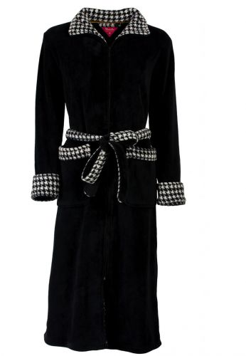 Deze zwarte badjas met rits is gemaakt van fleece en is voorzien van een Pied de Poule dessin op de kraag en de omslag bij de mouwen.