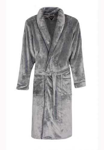 Een licht grijze herenbadjas met elegante bies voor de stijlvolle mannen onder ons! 100% flanel fleece.